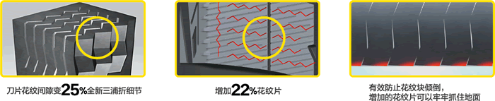 即采用立體式刀片花紋溝槽設(shè)計(jì),使花紋片溝槽間隙變薄25%,同時(shí)減少花紋片之間的間隙,目的是抑制花紋塊的傾倒。鋒利的溝槽邊緣能更好地抓住地面,同時(shí)也進(jìn)一步增加了輪胎和冰面的接觸面積,改善座駕直線行駛時(shí)的牽引力及彎道行駛時(shí)的穩(wěn)定性,讓您在征服嚴(yán)冬的路上操控自如。