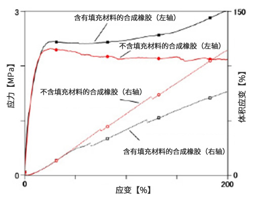 通過研究含有填充材料的合成橡膠與不含填充材料的合成橡膠的拉伸應(yīng)力、體積應(yīng)變及應(yīng)變之間的關(guān)系,我們發(fā)現(xiàn),不論是否含有填充材料,隨著合成橡膠的應(yīng)變增大,其體積應(yīng)變也會隨之明顯增加。由此可以看出,由于約束應(yīng)變,橡膠內(nèi)部產(chǎn)生了孔洞。